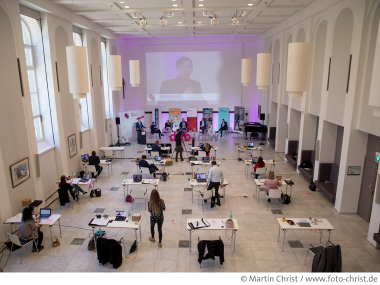 Ein ungewohntes Bild zeigte sich am vergangenen Freitag im Kardinal Schulte Haus in Bergisch Gladbach. Da, wo eigentlich 150 Gäste sitzen sollten, lagen vor allem viele Strippen, dazwischen waren wenige weit aus­ein­andergerückte Einzeltische aufgebaut. Direkt vor dem Podium strahlten statt vieler bekannter Gesichter riesige Monitore. Laptops, Mikrofone und Mehrfach­steck­dosen gehörten zu den wichtigsten Utensilien des Tages. Statt mit freudigen Umarmungen begann die Veranstaltung für die Landesjugendleitung und das Team um sie herum mit Corona-Tests und Distanz. Das schwierigste: Die, die eigentlich die Veranstaltung aus­machen – die jungen Mitglieder der Deutschen Beamtenbund-Jugend Nordrhein-Westfalen (dbb jugend nrw) -, durften aufgrund zu hoher Inzidenzwerte nicht nach Bergisch Gladbach kommen.